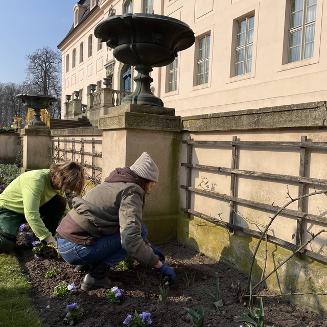 Zu den Highlights gehört das rekonstruierte Kronenbeet auf der Seeseite des Schlosses, in dessen Mitte der Fürst zumindest zeitweilig ein rosenumranktes S für Schnucke aufstellen ließ. Unser Verein übergibt zu diesem Anlass die zwei wiedergefundenen und restaurierten Korallenständer mit ihren Muschelschalen.