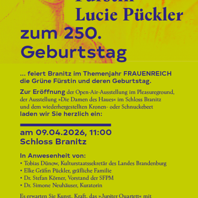 Anlässlich des 250. Geburtstags der Fürstin Pückler am 9. April steht ihr Wirken in und für Branitz im Fokus. Die Open-Air-Ausstellung an fünf Stationen gibt Einblicke in die Anfangsjahre der Parkanlage und der Gärtnerei, informiert über die ersten Umbauten am und im Schloss und die Grundlagen für das Traumreich Branitz, die die kluge und erfahrene Tochter des Staatskanzlers Hardenberg in ihren letzten Lebensjahren schuf.